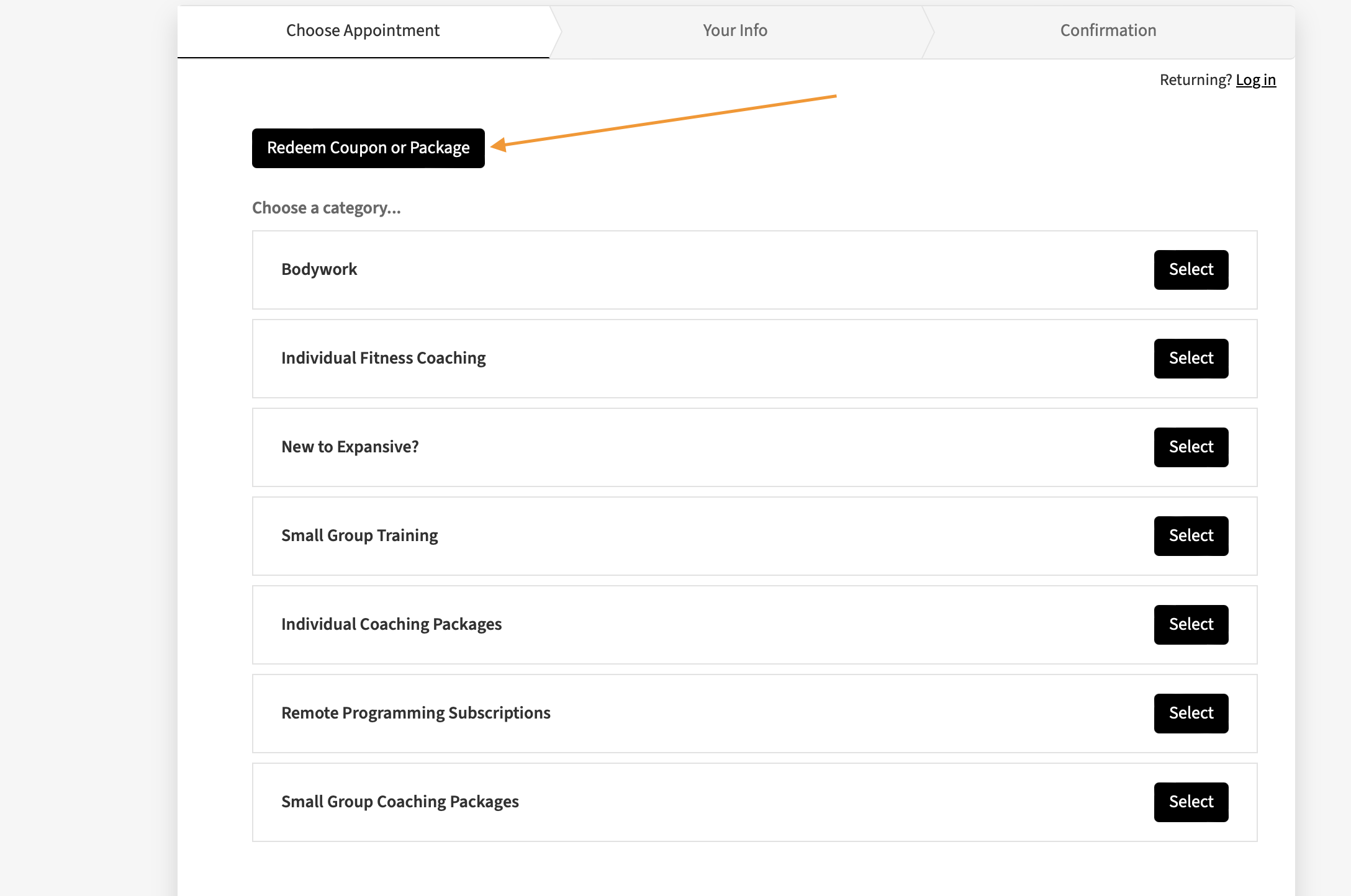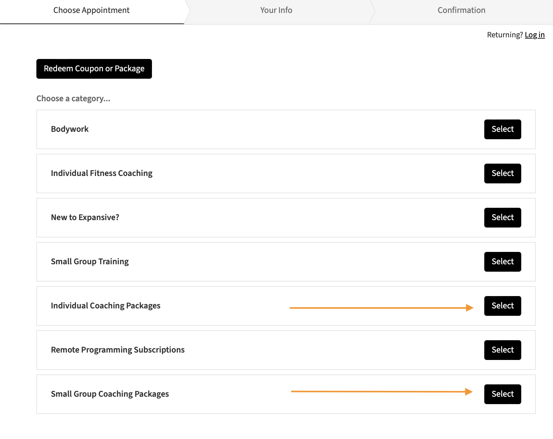 Step 2: Select “Individual Coaching Packages” if you would like individual fitness coaching. Select “Small Group Coaching Packages” if you prefer small group classes.