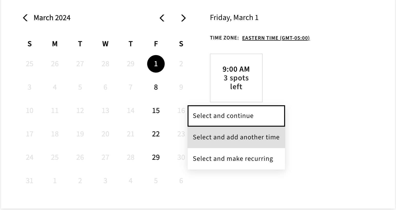 Step 5: Scroll down to the calendar at the bottom of the page. Only open sessions for your type of package will show up. When you select the first date and time that works for you, you will be given a dropdown menu. If you are signing up for multiple classes on nonconsecutive weeks, choose “Select and Add Another Time.” If you are signing up for classes on consecutive weeks, choose “Select and Make Recurring.”