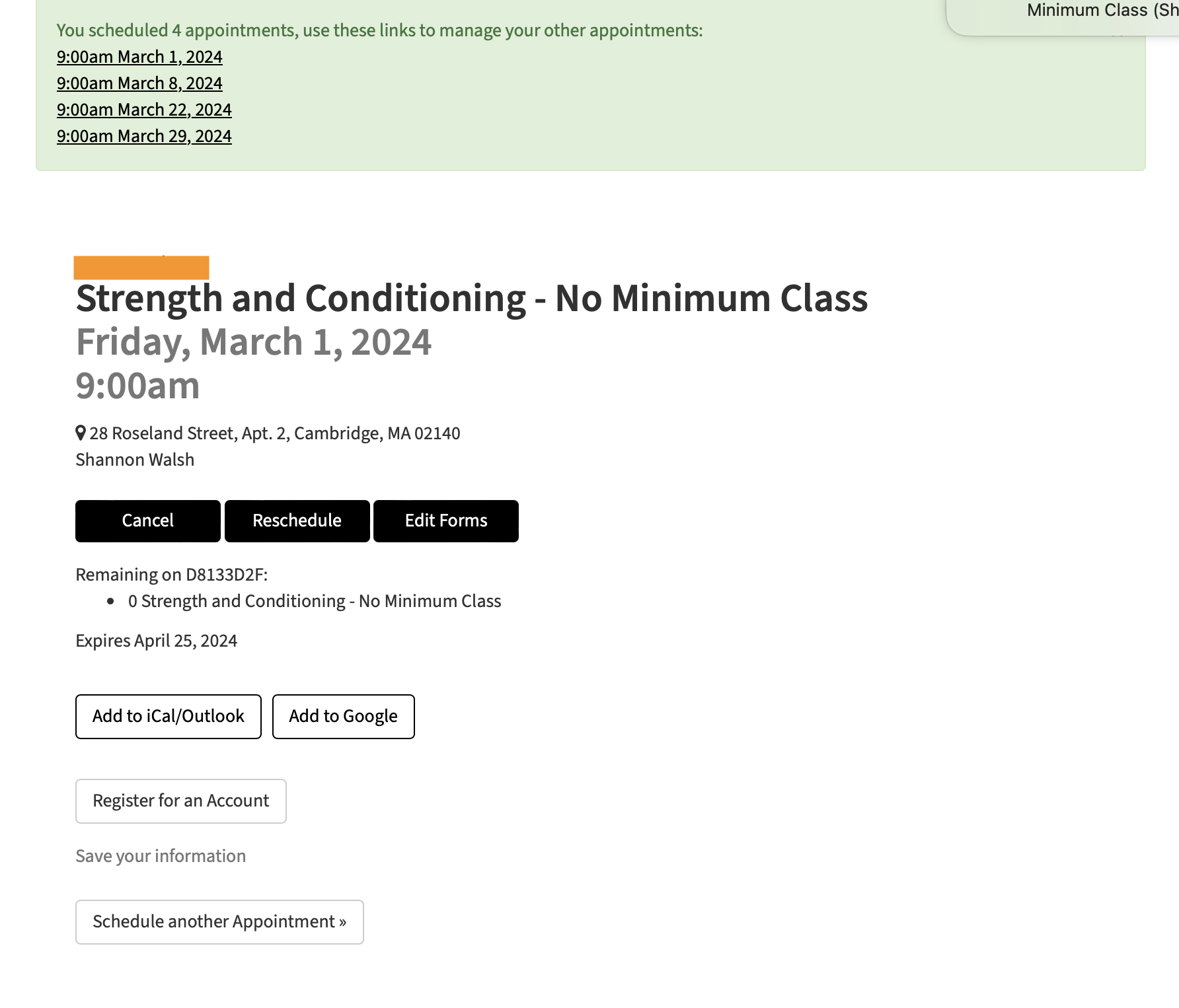 Step 4: When your code is accepted, you’ll see a summary of your purchase in green at the top of the page, including the type of package, number of sessions, and expiration date.