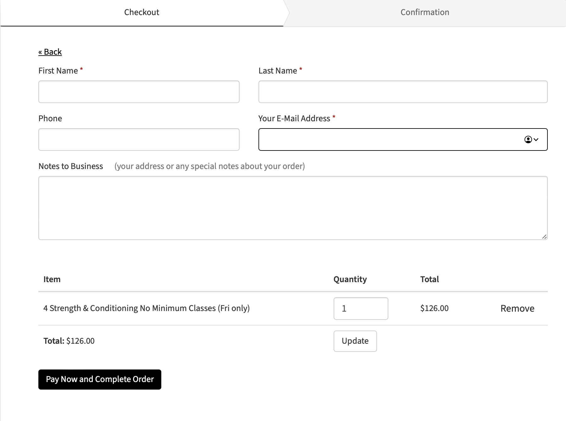 Step 4: You will automatically be taken to your cart. Fill in your name and email address. A summary of your purchase will be at the bottom of the page along with the total. When you are ready, select “Pay Now and Complete Order.”